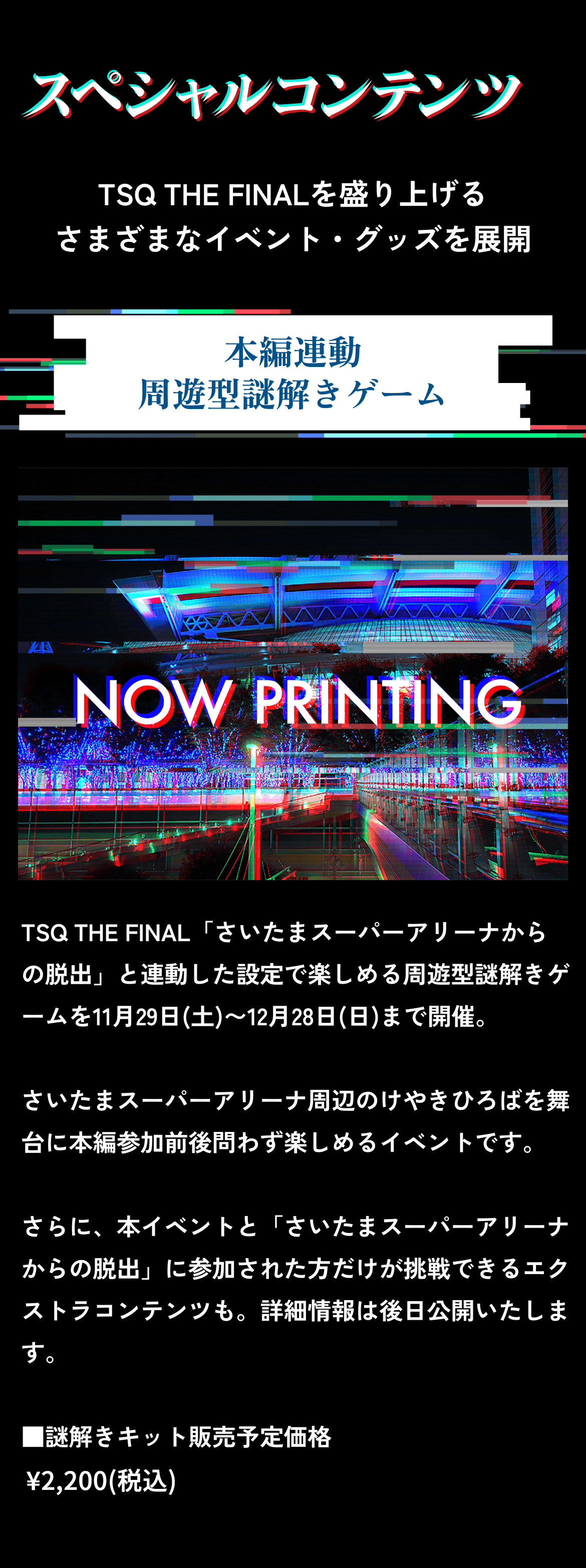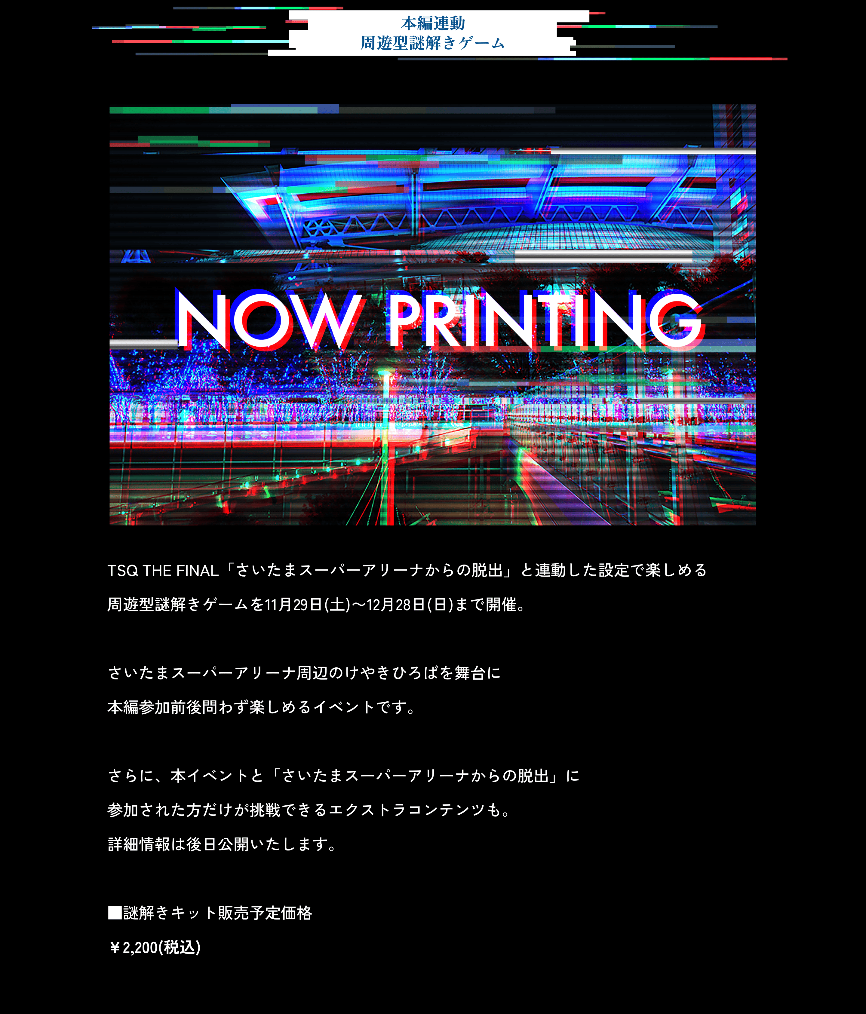 ※本ゲームならびに「さいたまスーパーアリーナからの脱出」両方のイベントにご参加いただいた方のみ挑戦できる”エクストラコンテンツ”は12/27,12/28のみプレイ可能となります。プレイ時間目安、終了時間等の詳細情報は後日公開いたします。